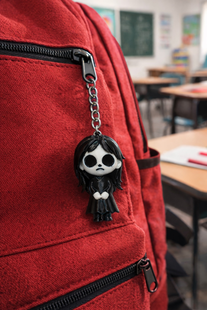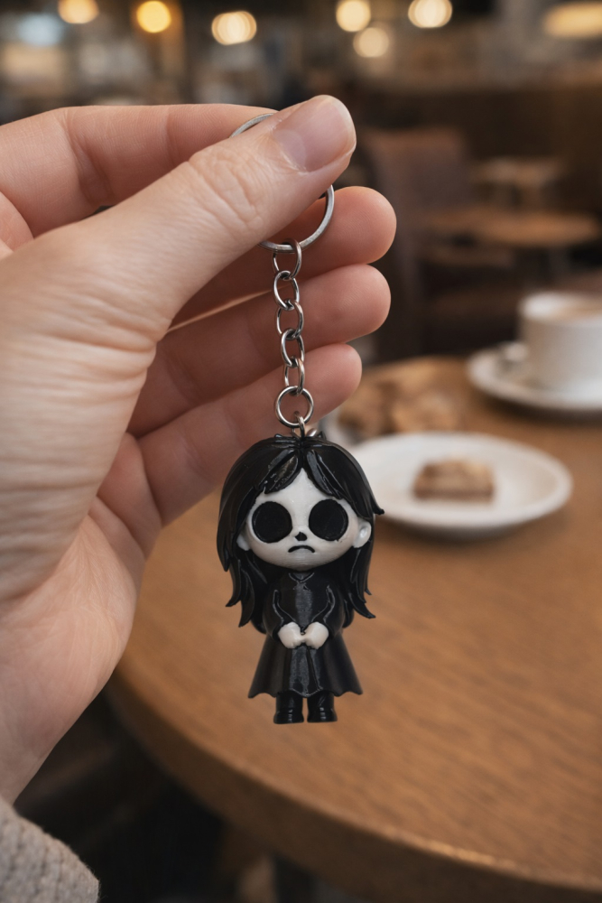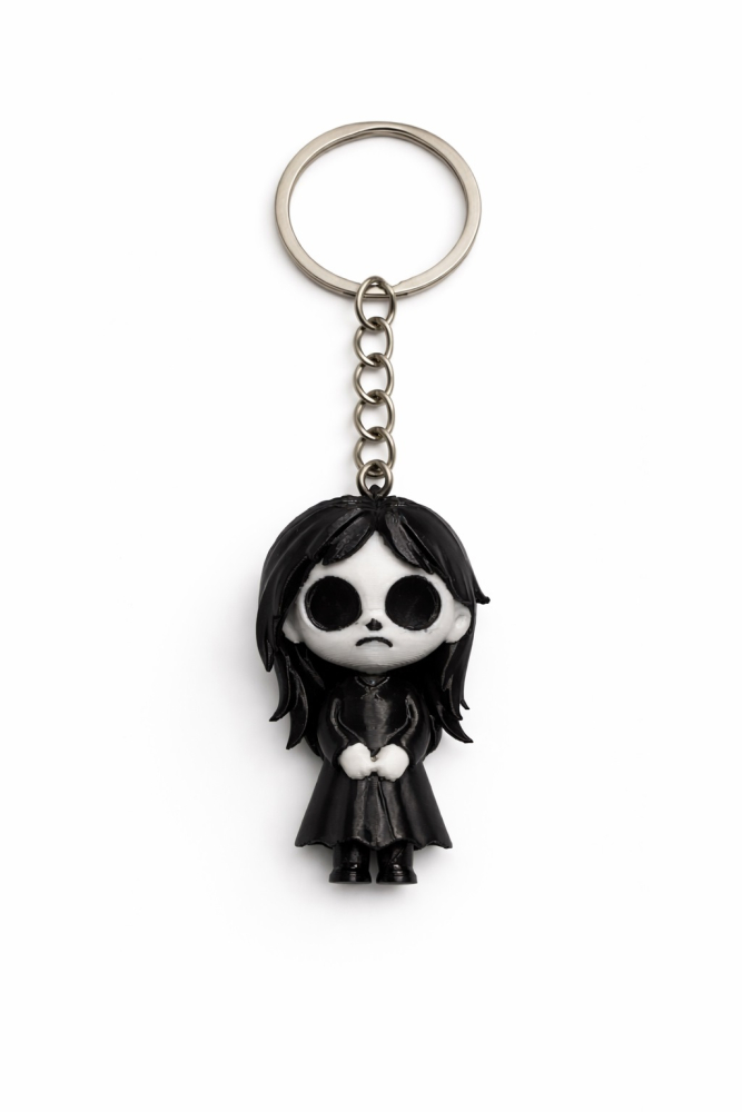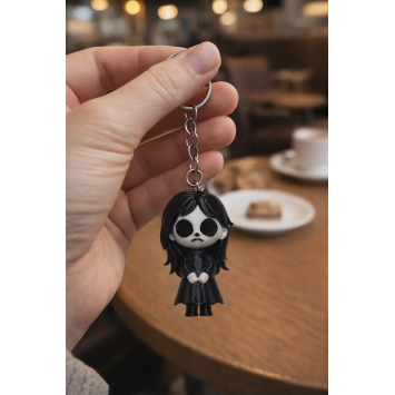 Брелок «Темна лялька» — це атмосферний аксесуар для ключів, рюкзака або сумки, надрукований на 3D-принтері з міцного пластику. Його образ поєднує елементи готичного стилю, меланхолії та милої лялькової естетики.
