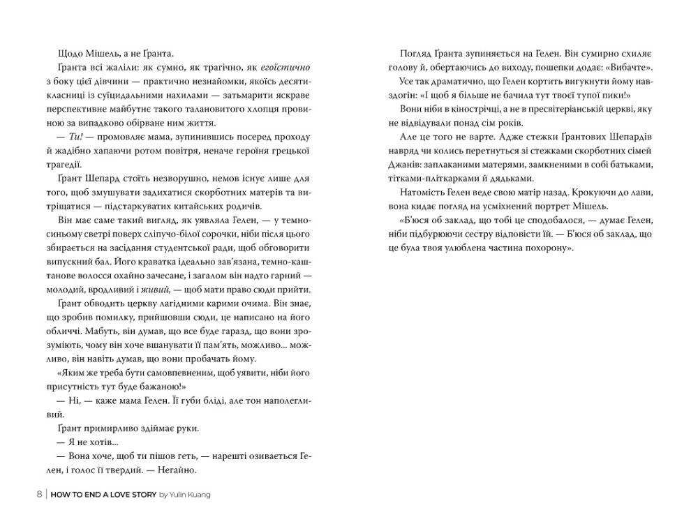 Як завершити історію кохання – це ніжний і пронизливий роман сучасної авторки Юлінь Кван, який торкається найглибших людських почуттів. У центрі сюжету – жінка, яка після болісного розриву намагається зрозуміти, як закінчити історію, що досі живе в її серці. Це книга про любов і прощення, про страх і надію, про те, що навіть кінець може стати початком нового етапу життя. Авторка тонко показує внутрішній світ героїні, її боротьбу між минулим і бажанням рухатись уперед.