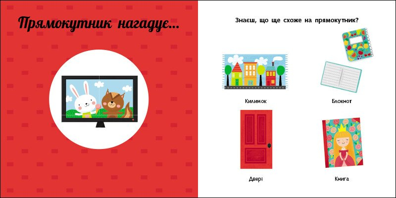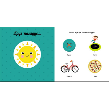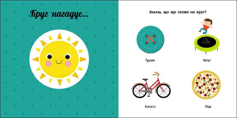 А на наступній сторінці потренуйтеся, розглядаючи милі ілюстрації з предметами певної форми.