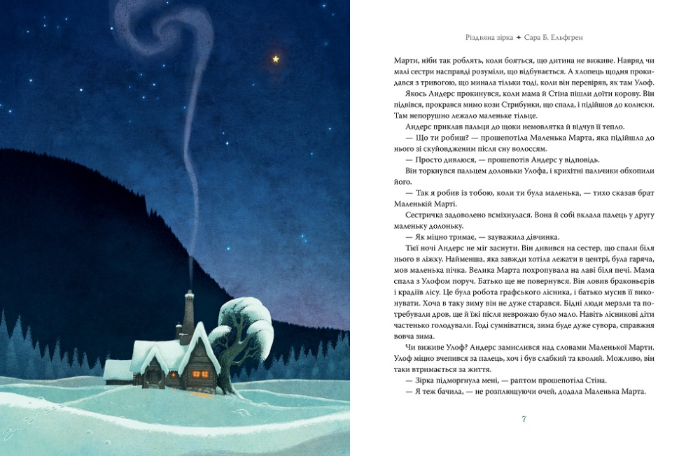 Різдвяна зірка це зворушлива різдвяна історія від шведської письменниці Сари Б. Ельфґрен про диво, надію та родинне тепло. Книга наповнена зимовою атмосферою, світлом, щирими почуттями і спогадами дитинства. Це саме та різдвяна книга, яку хочеться перечитувати щороку напередодні свят. Авторка вміло поєднала реалістичність і казковість, створивши історію, що залишає після себе відчуття затишку і любові. Різдвяна зірка ідеально підійде для спільного читання всією сім’єю.