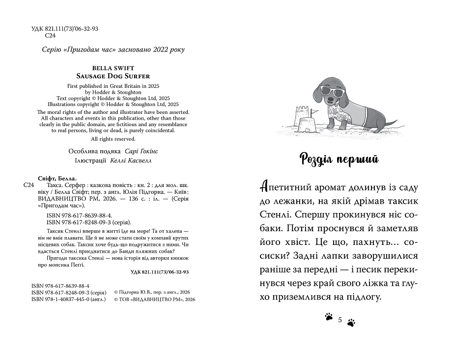 Такса. Серфер — це добра й динамічна дитяча книга Белли Свіфт про пригоди маленької такси, яка мріє про великі відкриття. Авторка створює теплу атмосферу, поєднуючи гумор, щирі емоції та важливі теми дружби й підтримки. Сучасна дитяча література в цій повісті допомагає дітям краще розуміти почуття, відповідальність і цінність взаємодопомоги.