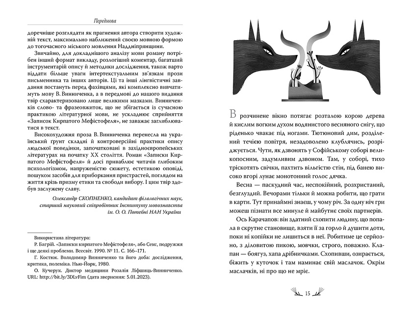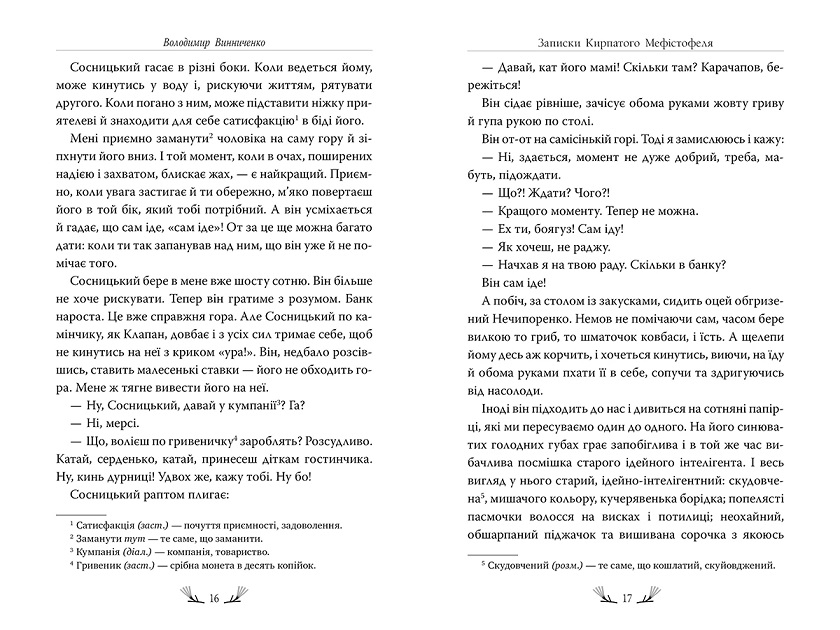 Роман Записки Кирпатого Мефістофеля — це глибока сповідь героя-бунтаря, що кидає виклик лицемірству суспільства та розкриває внутрішній конфлікт між бажанням правди і ціною, яку за неї доводиться платити. Володимир Винниченко майстерно створює атмосферу боротьби і сумнівів, змушуючи читача зануритися в рефлексії героя, який, мов Мефістофель, провокує, випробовує та змінюється сам.
