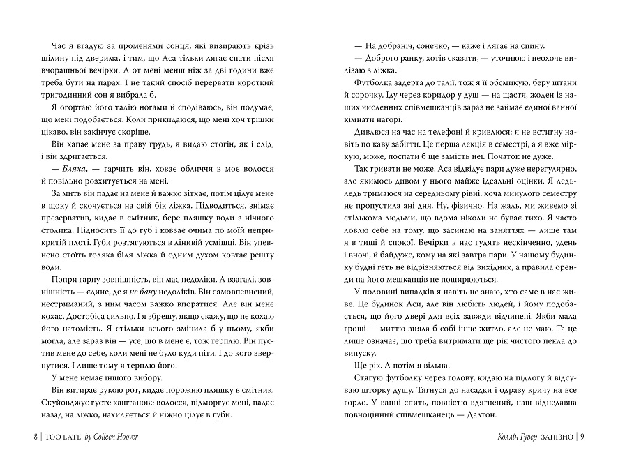 Запізно Коллін Гувер — напружений сучасний роман про кохання, залежність і вибір, що змінює життя. Студентка з непростим минулим потрапляє у вир стосунків, де пристрасть межує з небезпекою, а довіра випробовується кожним кроком. Коли на її шляху зявляється людина, здатна подарувати підтримку і надію, героїні доводиться визначити власні межі та знайти голос, аби сказати собі досить. Авторка загострює увагу на психологічному тиску, маніпуляціях і другому шансі, розкриваючи, як любов може бути одночасно ліками і пасткою. Текст тримає у напрузі завдяки швидким діалогам, атмосфері небезпеки та моральним дилемам, а фінал змушує замислитися про ціну свободи. Запізно — історія про те, що навіть у найбезнадійніших обставинах можливо вибрати світло, переосмислити себе і зробити крок до нового життя.