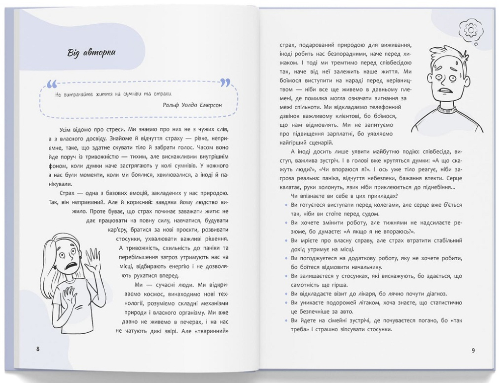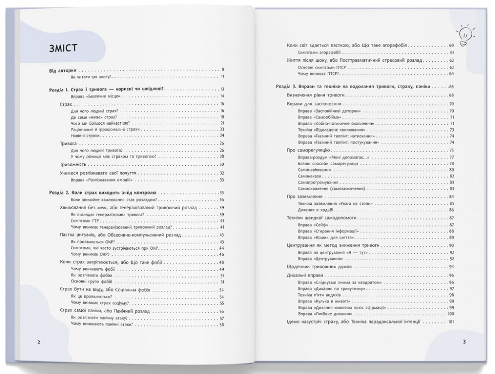 Книга зосереджена на найпоширеніших станах сучасної людини — страху, тривозі та стресі. У ній зібрано 120 дієвих методик і вправ, які можна застосовувати в повсякденному житті: від дихальних практик і технік самозаспокоєння до змін у мисленні та поведінці.