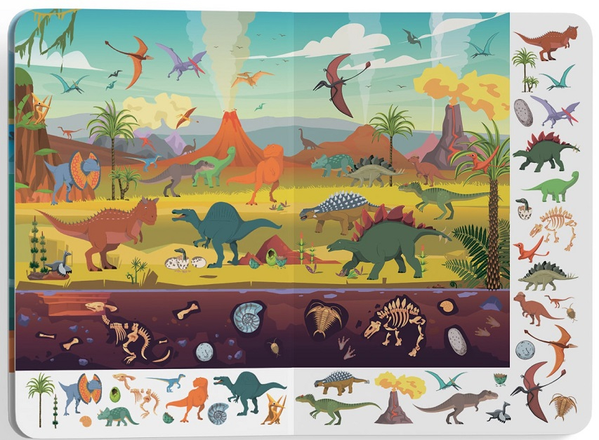 - Захопливі великі ілюстрації з доісторичного світу.