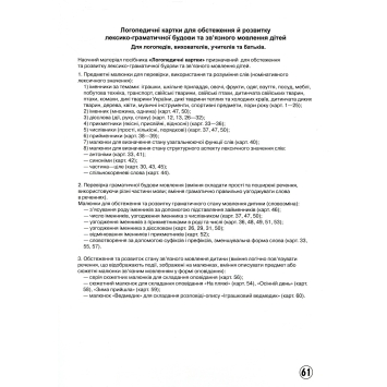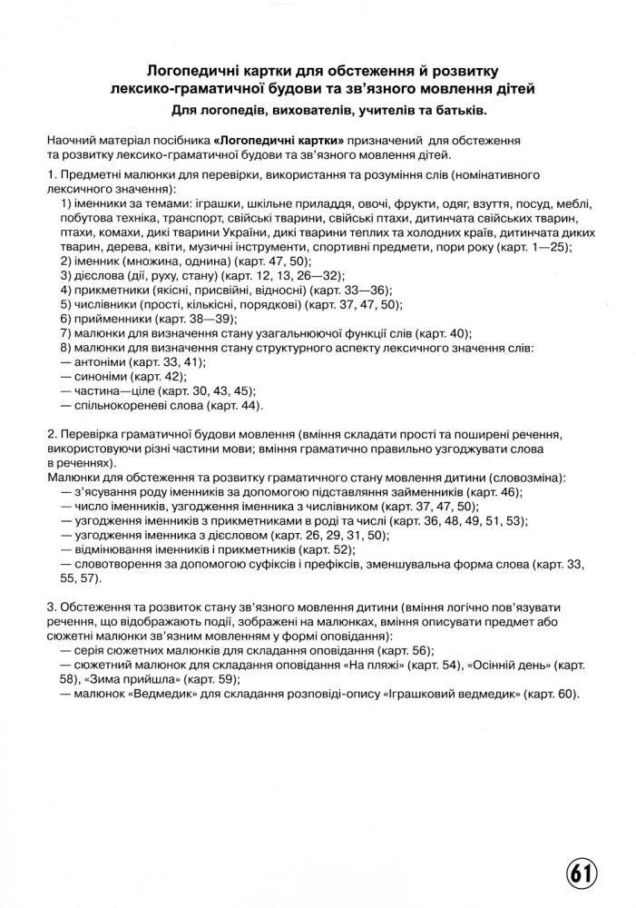 Набір рекомендований логопедам, вихователям, вчителям початкових класів і батькам, які прагнуть підтримати мовленнєвий розвиток дитини. Логопедичні картки 60 шт стануть корисним інструментом для індивідуальної та групової роботи, особливо при формуванні лексико-граматична будова мовлення та розвиток зв’язного мовлення.