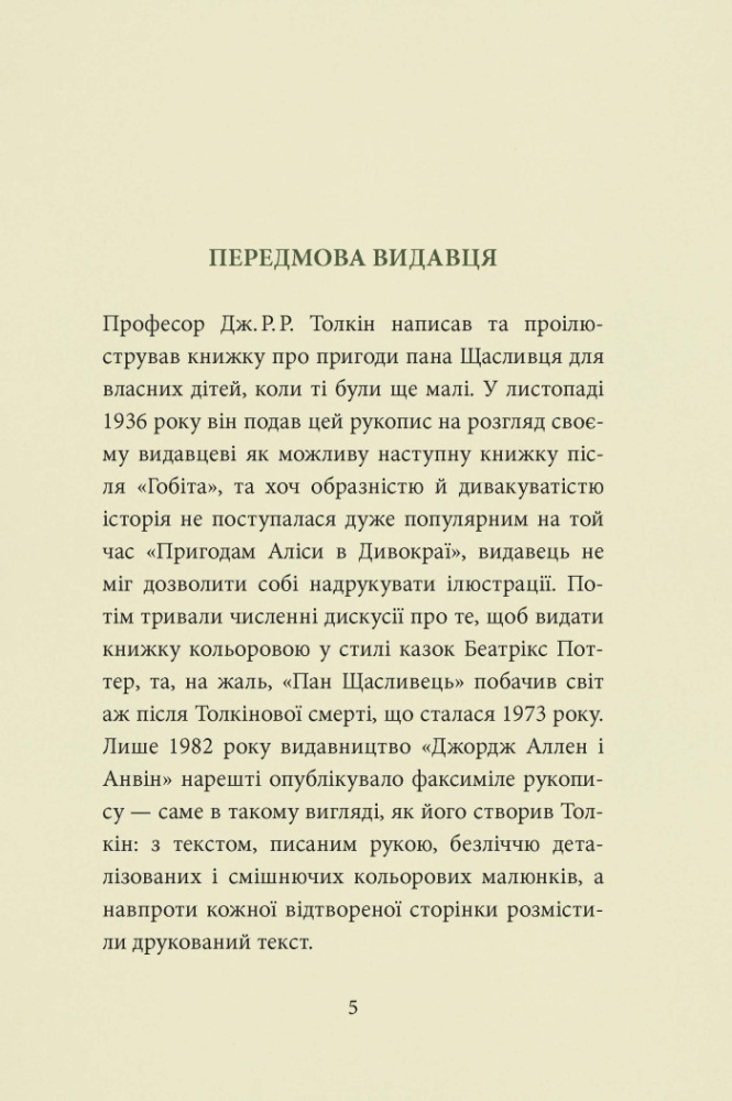 Знаете ли вы, что Джон Р. Р. Толкин, всемирно известный автор эпического фэнтези, писал также очаровательные истории для самых маленьких читателей? Книга «Мистер Блисс» (в украинском переводе «Пан Щасливець») — это уникальное издание, объединяющее текст и иллюстрации, созданные самим писателем. Впервые опубликованная только в 1982 году, через девять лет после смерти автора, эта повесть теперь доступна и на украинском языке благодаря переводу Катерины Михальчишиной и издательству «Астролябия». Это настоящий подарок для коллекционеров и всех, кто хочет познакомить детей с мягким юмором и неповторимым миром Толкина.