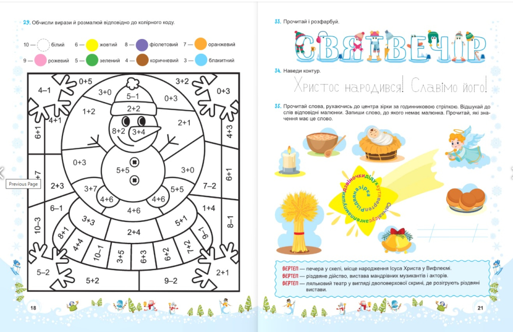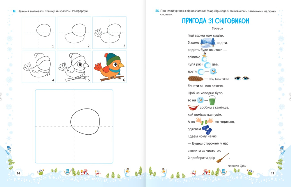 Зошит Сніговичок. Зимові канікули. 1 клас побудований у вигляді казкової подорожі. На кожній сторінці діти виконують завдання разом із Сніговичком: читають короткі тексти, рахують предмети, вписують букви, малюють і розгадують загадки. Завдяки ігровому формату навчання проходить невимушено, а повторення матеріалу стає захопливим. Ілюстрації та кольорові завдання стимулюють творчість і підтримують інтерес до знань.