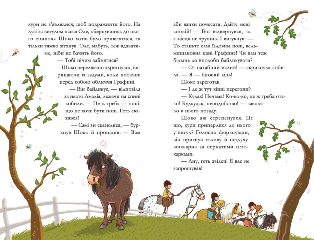 Гріються на сонечку, розважаються, досхочу пасуться та дражнять пані курей. Та от халепа: одного дня хазяйка вбила собі в голову, що поні відтепер братимуть участь у заняттях із верхової їзди...