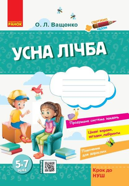 Зошит Стартуємо разом Усна лічба Ващенко О, 64 с. - Посібник призначений для роботи з дітьми 5–7 років, які збираються йти до школи, та може використовуватися як додатковий зошит у 1 класі.