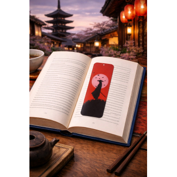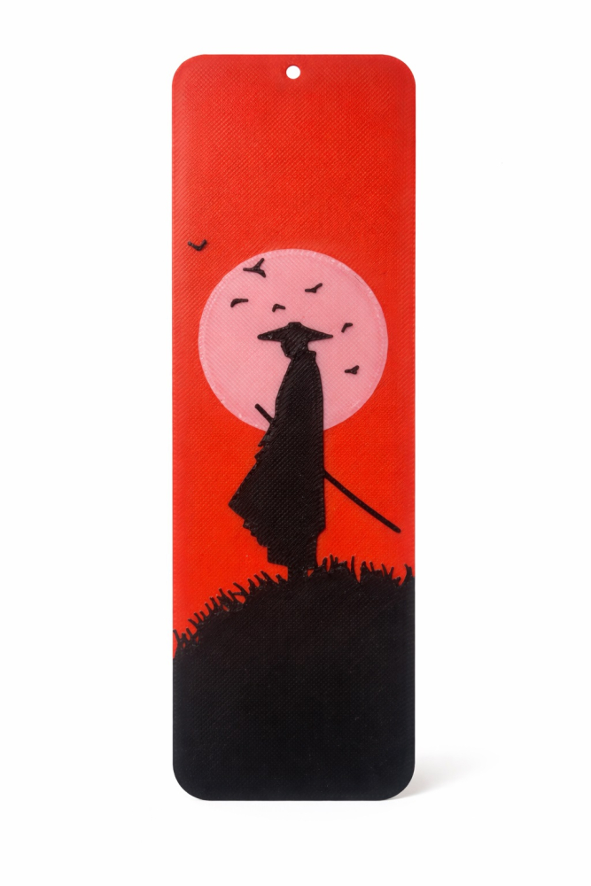 «Червоне сонце самурая» — це атмосферна 3D закладка для книг у японському стилі з виразним силуетом воїна на тлі великого червоного сонця. Мінімалістична композиція символізує честь, силу духу та внутрішню зосередженість.