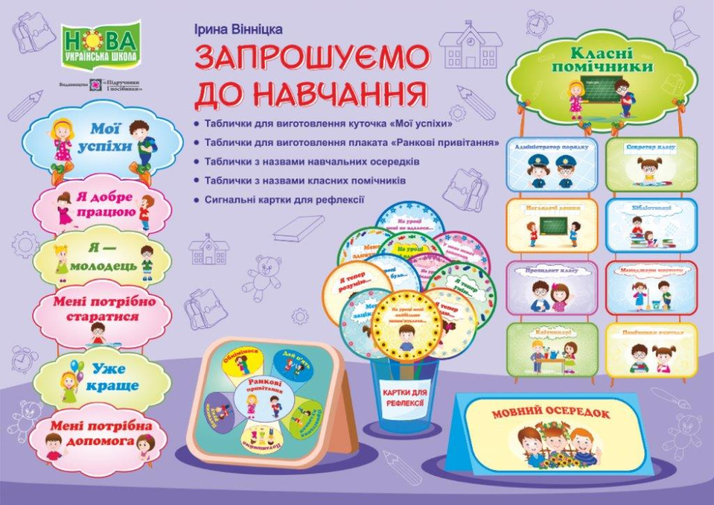 Комплект Запрошуємо до навчання буде корисним для вчителів початкових класів, допоможе облаштувати комфортне, яскраве освітнє середовище.